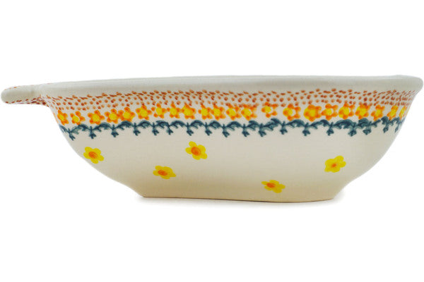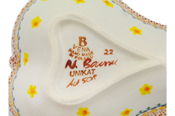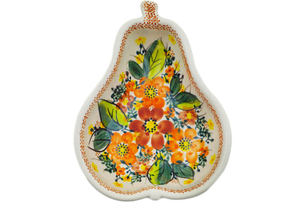 This Sunset Meadow 7" Pear Shaped Bowl was handmade and hand decorated in Boleslawiec, Poland by skilled artisans according to old traditional methods. This is a Polish pottery Signature Unikat, which means that it has been hand painted with both sponges and brushes and it is signed by the artist who painted it. Unikat pieces are the most intricate works of art. Larger Unikat items take hours of very careful work to finish. This Polish stoneware is microwave, dishwasher, freezer, and oven safe up to 480°F. It does not contain lead or cadmium. It is part of the Sunset Meadow Collection.