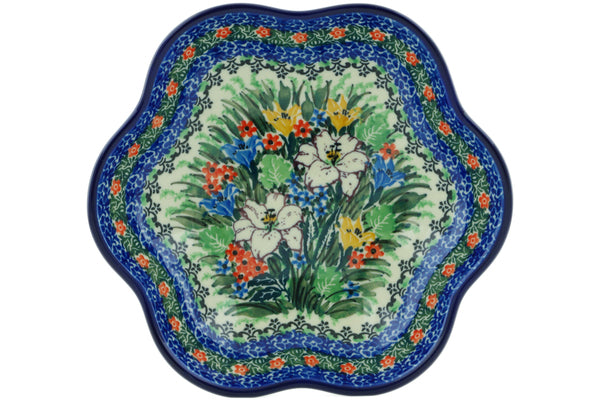This White Lily Meadow 8" Scalloped Fluted Bowl was handmade and hand decorated in Boleslawiec, Poland by skilled artisans according to old traditional methods. This is a Polish pottery Signature Unikat, which means that it has been hand painted with both sponges and brushes and it is signed by the artist who painted it. Unikat pieces are the most intricate works of art. Larger Unikat items take hours of very careful work to finish. This Polish stoneware is microwave, dishwasher, freezer, and oven safe up to 480°F. It does not contain lead or cadmium. It is part of the White Lily Meadow Collection.