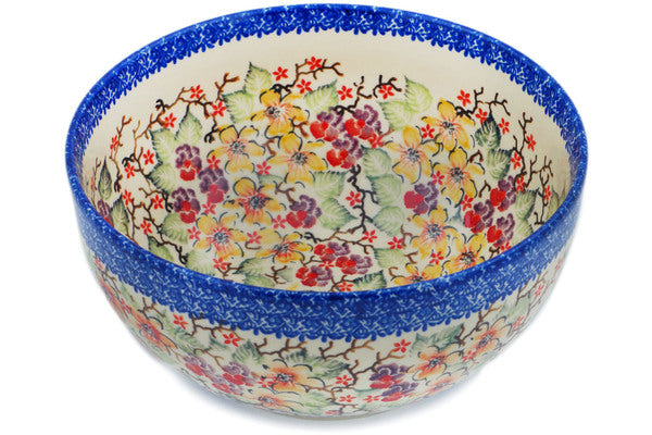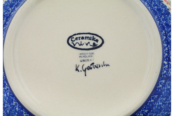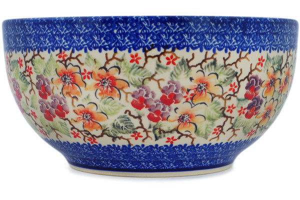This Dogwood Dreams 9" Bowl was handmade and hand decorated in Boleslawiec, Poland by skilled artisans according to old traditional methods. This is a Polish pottery Signature Unikat, which means that it has been hand painted with both sponges and brushes and it is signed by the artist who painted it. Unikat pieces are the most intricate works of art. Larger Unikat items take hours of very careful work to finish. This Polish stoneware is microwave, dishwasher, freezer, and oven safe up to 480°F. It does not contain lead or cadmium. It is part of the Dogwood Dreams Collection.