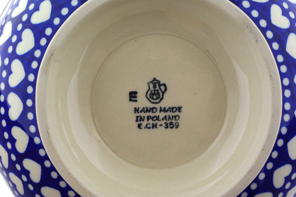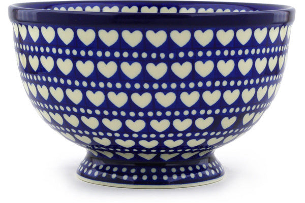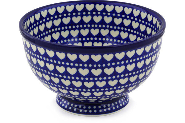 This Heart To Heart 9" Bowl with Pedestal was handmade and hand decorated in Boleslawiec, Poland by skilled artisans according to old traditional methods. This Polish stoneware is microwave, dishwasher, freezer, and oven safe up to 480°F. It does not contain lead or cadmium. It is part of the Heart To Heart Collection.