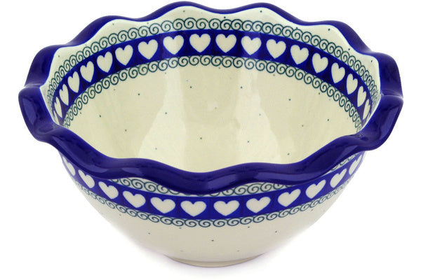 This Light Hearted 9" Scalloped Bowl was handmade and hand decorated in Boleslawiec, Poland by skilled artisans according to old traditional methods. This Polish stoneware is microwave, dishwasher, freezer, and oven safe up to 480°F. It does not contain lead or cadmium. It is part of the Light Hearted Collection.