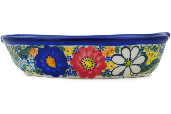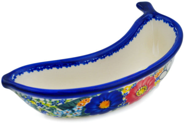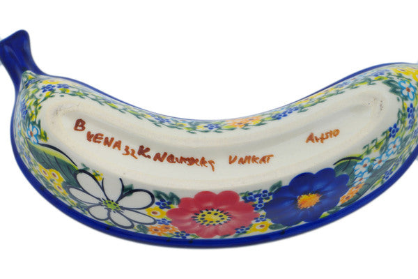 This Magical Spring 9" Banana Shaped Bowl was handmade and hand decorated in Boleslawiec, Poland by skilled artisans according to old traditional methods. This is a Polish pottery Signature Unikat, which means that it has been hand painted with both sponges and brushes and it is signed by the artist who painted it. Unikat pieces are the most intricate works of art. Larger Unikat items take hours of very careful work to finish. This Polish stoneware is microwave, dishwasher, freezer, and oven safe up to 480°F. It does not contain lead or cadmium. It is part of the Magical Spring Collection.