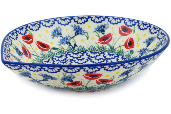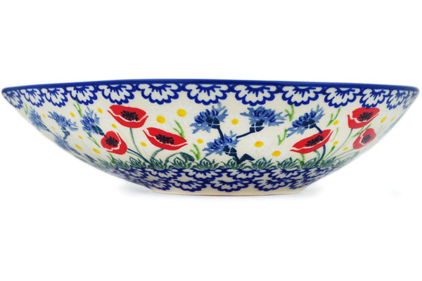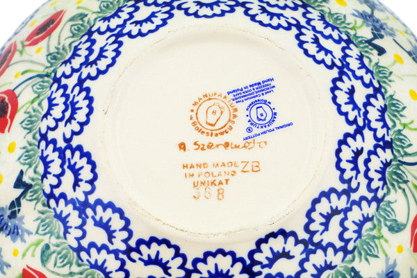 This Poppies and Cornflowers 9" Bowl was handmade and hand decorated in Boleslawiec, Poland by skilled artisans according to old traditional methods. This is a Polish pottery Signature Unikat, which means that it has been hand painted with both sponges and brushes and it is signed by the artist who painted it. Unikat pieces are the most intricate works of art. Larger Unikat items take hours of very careful work to finish. This Polish stoneware is microwave, dishwasher, freezer, and oven safe up to 480°F. It does not contain lead or cadmium. It is part of the Poppies and Cornflowers Collection.