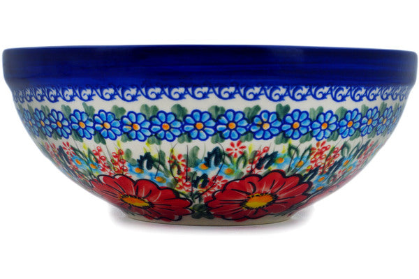 This Red Hibiscus 9" Bowl was handmade and hand decorated in Boleslawiec, Poland by skilled artisans according to old traditional methods. This is a Polish pottery Signature Unikat, which means that it has been hand painted with both sponges and brushes and it is signed by the artist who painted it. Unikat pieces are the most intricate works of art. Larger Unikat items take hours of very careful work to finish. This Polish stoneware is microwave, dishwasher, freezer, and oven safe up to 480°F. It does not contain lead or cadmium. It is part of the Red Hibiscus Collection.