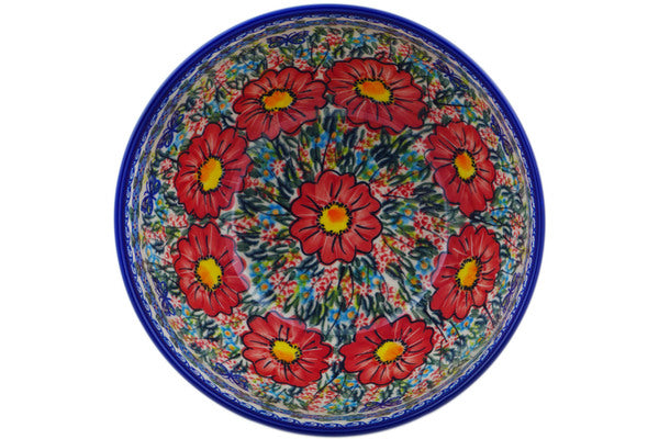This Red Hibiscus 9" Bowl was handmade and hand decorated in Boleslawiec, Poland by skilled artisans according to old traditional methods. This is a Polish pottery Signature Unikat, which means that it has been hand painted with both sponges and brushes and it is signed by the artist who painted it. Unikat pieces are the most intricate works of art. Larger Unikat items take hours of very careful work to finish. This Polish stoneware is microwave, dishwasher, freezer, and oven safe up to 480°F. It does not contain lead or cadmium. It is part of the Red Hibiscus Collection.