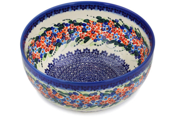 This Starburst Garland 9" Bowl was handmade and hand decorated in Boleslawiec, Poland by skilled artisans according to old traditional methods. This is a Polish pottery Signature Unikat, which means that it has been hand painted with both sponges and brushes and it is signed by the artist who painted it. Unikat pieces are the most intricate works of art. Larger Unikat items take hours of very careful work to finish. This Polish stoneware is microwave, dishwasher, freezer, and oven safe up to 480°F. It does not contain lead or cadmium. It is part of the Starburst Garland Collection.
