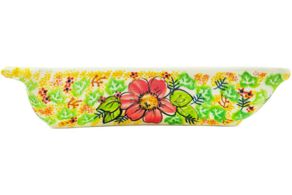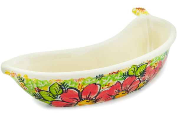 This Wild Peonies 9" Banana Shaped Bowl was handmade and hand decorated in Boleslawiec, Poland by skilled artisans according to old traditional methods. This is a Polish pottery Signature Unikat, which means that it has been hand painted with both sponges and brushes and it is signed by the artist who painted it. Unikat pieces are the most intricate works of art. Larger Unikat items take hours of very careful work to finish. This Polish stoneware is microwave, dishwasher, freezer, and oven safe up to 480°F. It does not contain lead or cadmium. It is part of the Wild Peonies Collection.
