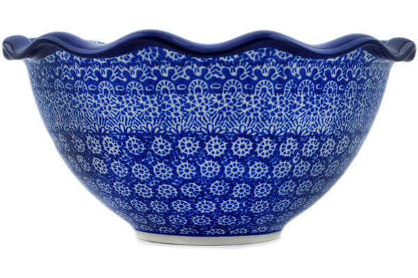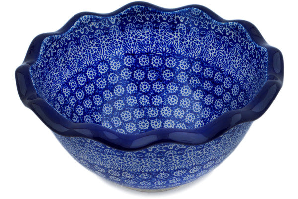 This Winter Frost 9" Scalloped Bowl was handmade and hand decorated in Boleslawiec, Poland by skilled artisans according to old traditional methods. This Polish stoneware is microwave, dishwasher, freezer, and oven safe up to 480°F. It does not contain lead or cadmium. It is part of the Winter Frost Collection.