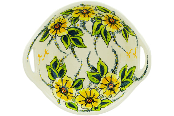 This Hawaii Sunshine 13" Bowl with Handles was handmade and hand decorated in Boleslawiec, Poland by skilled artisans according to old traditional methods. This is a Polish pottery Signature Unikat, which means that it has been hand painted with both sponges and brushes and it is signed by the artist who painted it. Unikat pieces are the most intricate works of art. Larger Unikat items take hours of very careful work to finish. This Polish stoneware is microwave, dishwasher, freezer, and oven safe up to 480°F. It does not contain lead or cadmium. It is part of the Hawaii Sunshine Collection.