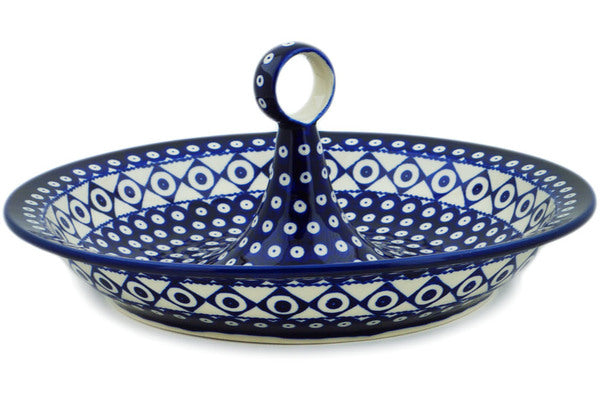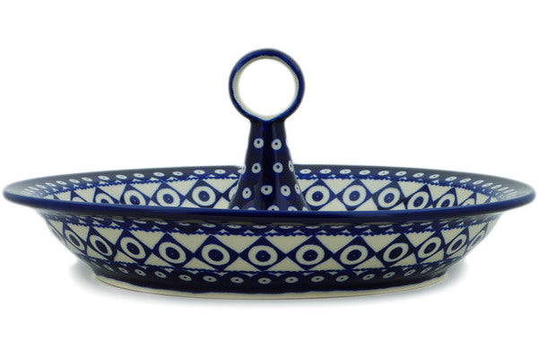 This Classic Peacock Vibes 14" Bowl with Handles was handmade and hand decorated in Boleslawiec, Poland by skilled artisans according to old traditional methods. This Polish stoneware is microwave, dishwasher, freezer, and oven safe up to 480°F. It does not contain lead or cadmium. It is part of the Classic Peacock Vibes Collection.