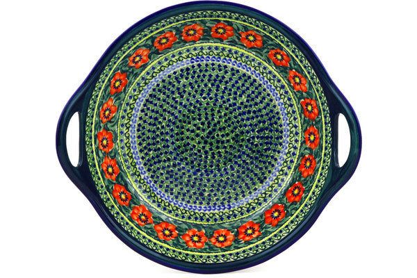 This Poppies All Around 15-inch Bowl with Handles was handmade and hand decorated in Boleslawiec, Poland by skilled artisans according to old traditional methods. This is a Polish pottery Signature Unikat, which means that it has been hand painted with both sponges and brushes and it is signed by the artist who painted it. Unikat pieces are the most intricate works of art. Larger Unikat items take hours of very careful work to finish. This Polish stoneware is microwave, dishwasher, freezer, and oven safe up to 480°F. It does not contain lead or cadmium. It is part of the Poppies All Around Collection.