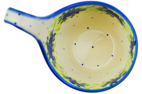 This Blueberries Season 7" Bowl with Loop-Handle was handmade and hand decorated in Boleslawiec, Poland by skilled artisans according to old traditional methods. This is a Polish pottery Signature Unikat, which means that it has been hand painted with both sponges and brushes and it is signed by the artist who painted it. Unikat pieces are the most intricate works of art. Larger Unikat items take hours of very careful work to finish. This Polish stoneware is microwave, dishwasher, freezer, and oven safe up to 480°F. It does not contain lead or cadmium. It is part of the Blueberries Season Collection.