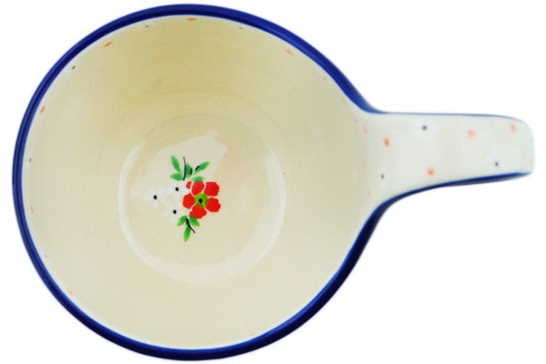 This Blushing Blooms 16 oz Bowl with Loop-Handle was handmade and hand decorated in Boleslawiec, Poland by skilled artisans according to old traditional methods. This Polish stoneware is microwave, dishwasher, freezer, and oven safe up to 480°F. It does not contain lead or cadmium. It is part of the Blushing Blooms Collection.