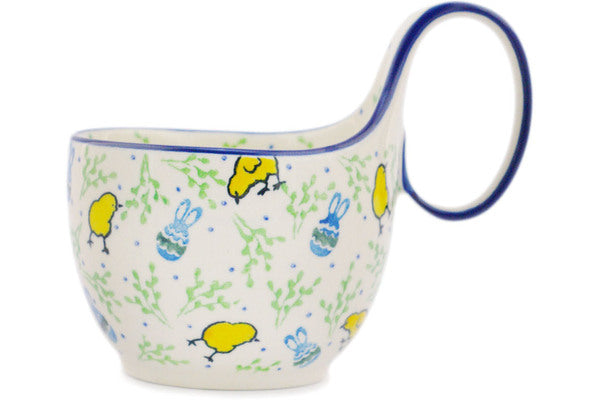 This Easter Day 16 oz Bowl with Loop-Handle was handmade and hand decorated in Boleslawiec, Poland by skilled artisans according to old traditional methods. This Polish stoneware is microwave, dishwasher, freezer, and oven safe up to 480°F. It does not contain lead or cadmium. It is part of the Easter Day Collection.