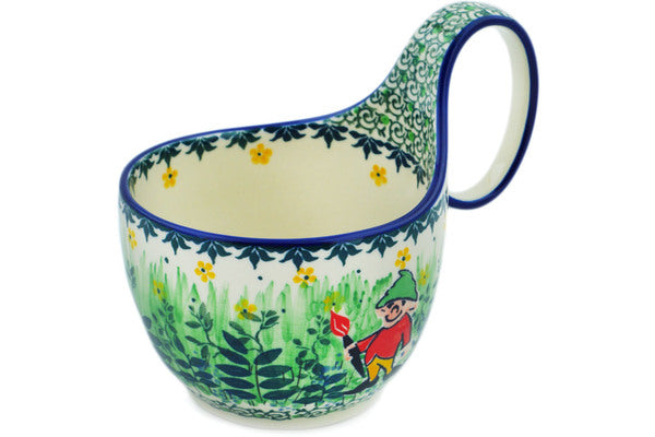 This Green Tranquility 16 oz Bowl with Loop-Handle was handmade and hand decorated in Boleslawiec, Poland by skilled artisans according to old traditional methods. This is a Polish pottery Signature Unikat, which means that it has been hand painted with both sponges and brushes and it is signed by the artist who painted it. Unikat pieces are the most intricate works of art. Larger Unikat items take hours of very careful work to finish. This Polish stoneware is microwave, dishwasher, freezer, and oven safe up to 480°F. It does not contain lead or cadmium. It is part of the Green Tranquility Collection.