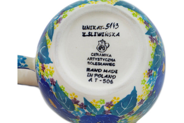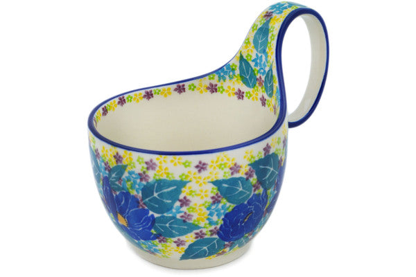 This Jovial 16 oz Bowl with Loop-Handle was handmade and hand decorated in Boleslawiec, Poland by skilled artisans according to old traditional methods. This is a Polish pottery Signature Unikat, which means that it has been hand painted with both sponges and brushes and it is signed by the artist who painted it. Unikat pieces are the most intricate works of art. Larger Unikat items take hours of very careful work to finish. This Polish stoneware is microwave, dishwasher, freezer, and oven safe up to 480°F. It does not contain lead or cadmium. It is part of the Jovial Collection.