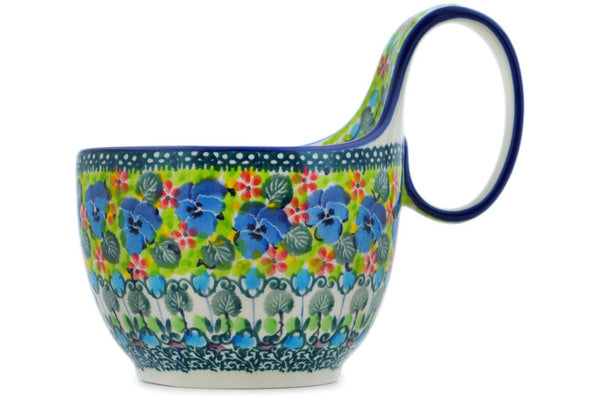 This Pretty Pansies 16 oz Bowl with Loop-Handle was handmade and hand decorated in Boleslawiec, Poland by skilled artisans according to old traditional methods. This is a Polish pottery Signature Unikat, which means that it has been hand painted with both sponges and brushes and it is signed by the artist who painted it. Unikat pieces are the most intricate works of art. Larger Unikat items take hours of very careful work to finish. This Polish stoneware is microwave, dishwasher, freezer, and oven safe up to 480°F. It does not contain lead or cadmium. It is part of the Pretty Pansies Collection.
