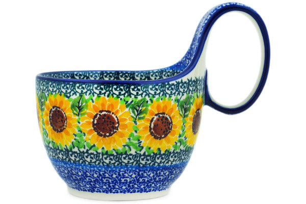 This Summer Sunnies 16 oz Bowl with Loop-Handle was handmade and hand decorated in Boleslawiec, Poland by skilled artisans according to old traditional methods. This is a Polish pottery Signature Unikat, which means that it has been hand painted with both sponges and brushes and it is signed by the artist who painted it. Unikat pieces are the most intricate works of art. Larger Unikat items take hours of very careful work to finish. This Polish stoneware is microwave, dishwasher, freezer, and oven safe up to 480°F. It does not contain lead or cadmium. It is part of the Summer Sunnies Collection.