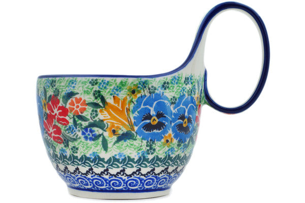 This Vibrant Bouquet 16 oz Bowl with Loop-Handle was handmade and hand decorated in Boleslawiec, Poland by skilled artisans according to old traditional methods. This is a Polish pottery Signature Unikat, which means that it has been hand painted with both sponges and brushes and it is signed by the artist who painted it. Unikat pieces are the most intricate works of art. Larger Unikat items take hours of very careful work to finish. This Polish stoneware is microwave, dishwasher, freezer, and oven safe up to 480°F. It does not contain lead or cadmium. It is part of the Vibrant Bouquet Collection.