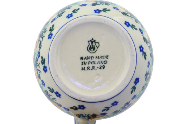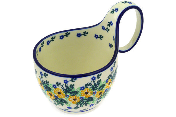 This Yellow Flower Wreath 16 oz Bowl with Loop-Handle was handmade and hand decorated in Boleslawiec, Poland by skilled artisans according to old traditional methods. This Polish stoneware is microwave, dishwasher, freezer, and oven safe up to 480°F. It does not contain lead or cadmium. It is part of the Yellow Flower Wreath Collection.