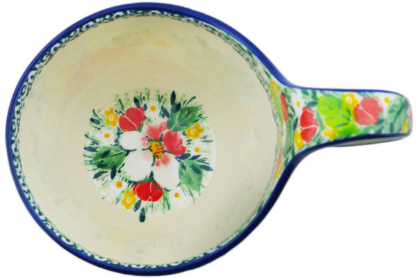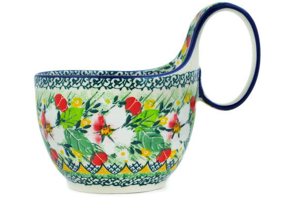 This Country Boutique 16 oz Bowl with Loop-Handle was handmade and hand decorated in Boleslawiec, Poland by skilled artisans according to old traditional methods. This is a Polish pottery Signature Unikat, which means that it has been hand painted with both sponges and brushes and it is signed by the artist who painted it. Unikat pieces are the most intricate works of art. Larger Unikat items take hours of very careful work to finish. This Polish stoneware is microwave, dishwasher, freezer, and oven safe up to 480°F. It does not contain lead or cadmium. It is part of the Country Boutique Collection.