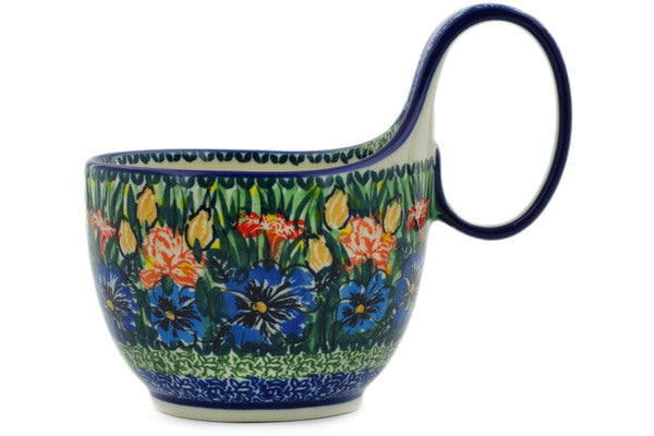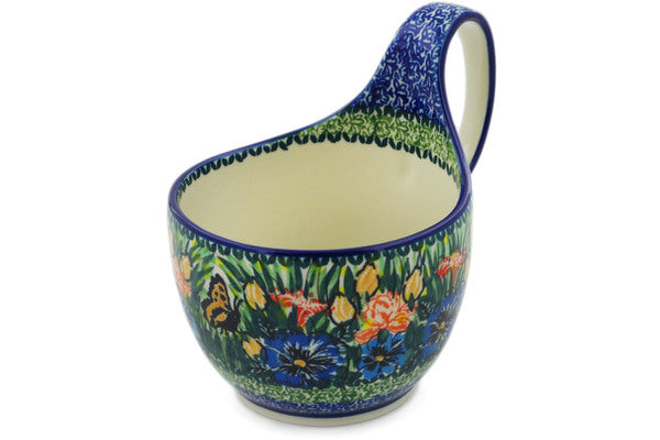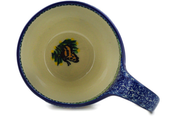 This Yellow Butterfly Pond 16 oz Bowl with Loop-Handle was handmade and hand decorated in Boleslawiec, Poland by skilled artisans according to old traditional methods. This is a Polish pottery Signature Unikat, which means that it has been hand painted with both sponges and brushes and it is signed by the artist who painted it. Unikat pieces are the most intricate works of art. Larger Unikat items take hours of very careful work to finish. This Polish stoneware is microwave, dishwasher, freezer, and oven safe up to 480°F. It does not contain lead or cadmium. It is part of the Yellow Butterfly Pond Collection.