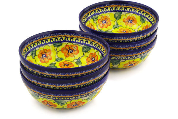 This Lemon Poppies Set of 6 Bowls was handmade and hand decorated in Boleslawiec, Poland by skilled artisans according to old traditional methods. This is a Polish pottery Signature Unikat, which means that it has been hand painted with both sponges and brushes and it is signed by the artist who painted it. Unikat pieces are the most intricate works of art. Larger Unikat items take hours of very careful work to finish. This Polish stoneware is microwave, dishwasher, freezer, and oven safe up to 480°F. It does not contain lead or cadmium. It is part of the Lemon Poppies Collection.
