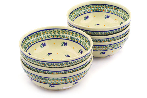 This Violet Tulips Set of 6 Bowls was handmade and hand decorated in Boleslawiec, Poland by skilled artisans according to old traditional methods. This Polish stoneware is microwave, dishwasher, freezer, and oven safe up to 480°F. It does not contain lead or cadmium. It is part of the Violet Tulips Collection.