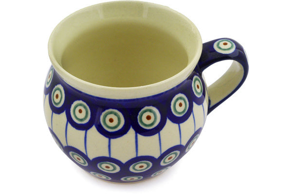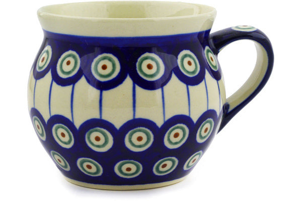 This Traditional Peacock 10 oz Bubble Mug was handmade and hand decorated in Boleslawiec, Poland by skilled artisans according to old traditional methods. This Polish stoneware is microwave, dishwasher, freezer, and oven safe up to 480°F. It does not contain lead or cadmium. It is part of the Traditional Peacock Collection.