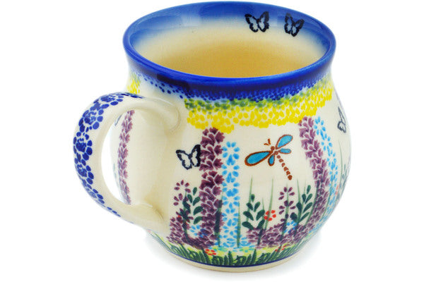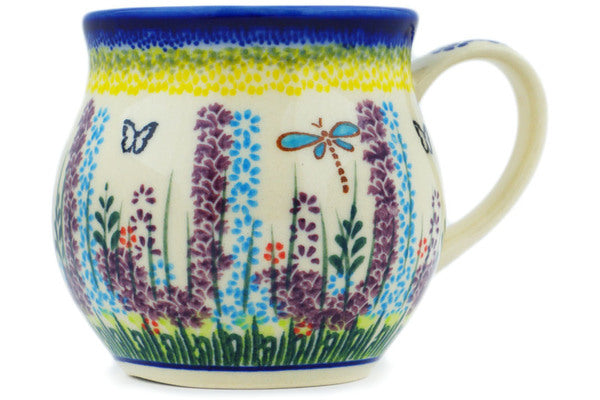 This Long Lavender 13 oz Bubble Mug was handmade and hand decorated in Boleslawiec, Poland by skilled artisans according to old traditional methods. This is a Polish pottery Signature Unikat, which means that it has been hand painted with both sponges and brushes and it is signed by the artist who painted it. Unikat pieces are the most intricate works of art. Larger Unikat items take hours of very careful work to finish. This Polish stoneware is microwave, dishwasher, freezer, and oven safe up to 480°F. It does not contain lead or cadmium. It is part of the Long Lavender Collection.