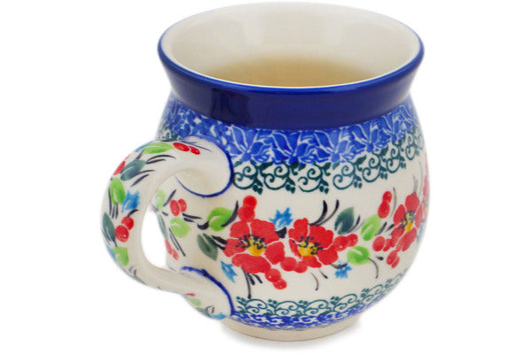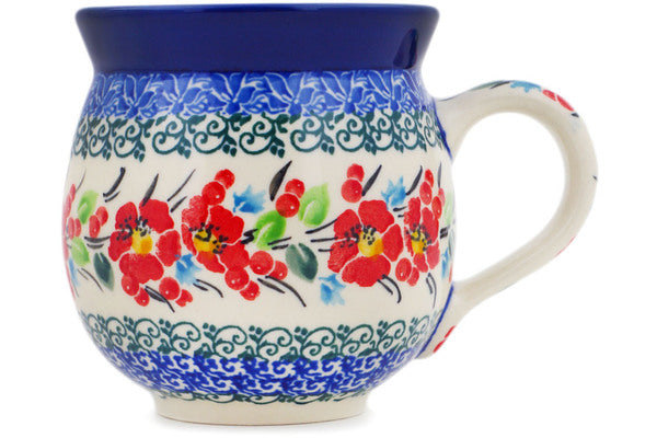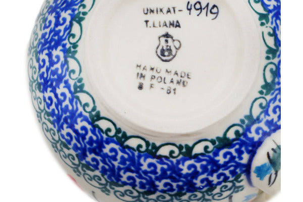This Cherry Colored Florals 12oz Bubble Mug was handmade and hand decorated in Boleslawiec, Poland by skilled artisans according to old traditional methods. This is a Polish pottery Signature Unikat, which means that it has been hand painted with both sponges and brushes and it is signed by the artist who painted it. Unikat pieces are the most intricate works of art. Larger Unikat items take hours of very careful work to finish. This Polish stoneware is microwave, dishwasher, freezer, and oven safe up to 480°F. It does not contain lead or cadmium. It is part of the Cherry Colored Florals Collection.