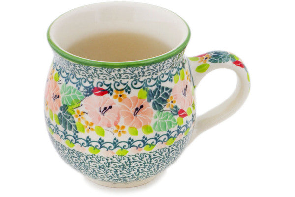 This Morning Divine 12oz Bubble Mug was handmade and hand decorated in Boleslawiec, Poland by skilled artisans according to old traditional methods. This is a Polish pottery Signature Unikat, which means that it has been hand painted with both sponges and brushes and it is signed by the artist who painted it. Unikat pieces are the most intricate works of art. Larger Unikat items take hours of very careful work to finish. This Polish stoneware is microwave, dishwasher, freezer, and oven safe up to 480°F. It does not contain lead or cadmium. It is part of the Morning Divine Collection.