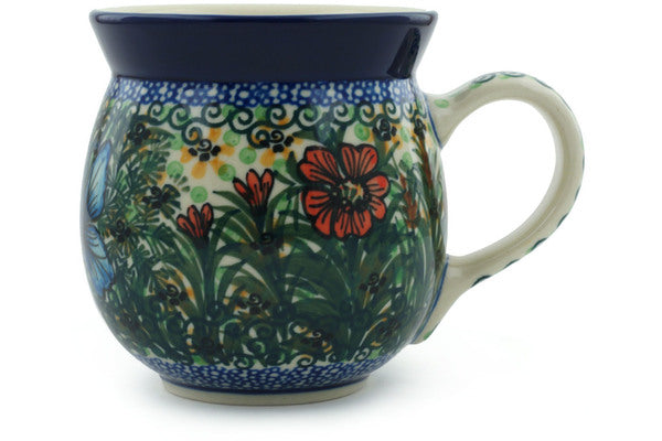 This Butterfly Holly 16 oz Bubble Mug was handmade and hand decorated in Boleslawiec, Poland by skilled artisans according to old traditional methods. This is a Polish pottery Signature Unikat, which means that it has been hand painted with both sponges and brushes and it is signed by the artist who painted it. Unikat pieces are the most intricate works of art. Larger Unikat items take hours of very careful work to finish. This Polish stoneware is microwave, dishwasher, freezer, and oven safe up to 480°F. It does not contain lead or cadmium. It is part of the Butterfly Holly Collection.