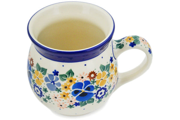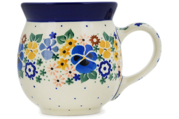 This Pansy Wreath 16 oz Bubble Mug was handmade and hand decorated in Boleslawiec, Poland by skilled artisans according to old traditional methods. This is a Polish pottery Signature Unikat, which means that it has been hand painted with both sponges and brushes and it is signed by the artist who painted it. Unikat pieces are the most intricate works of art. Larger Unikat items take hours of very careful work to finish. This Polish stoneware is microwave, dishwasher, freezer, and oven safe up to 480°F. It does not contain lead or cadmium. It is part of the Pansy Wreath Collection.