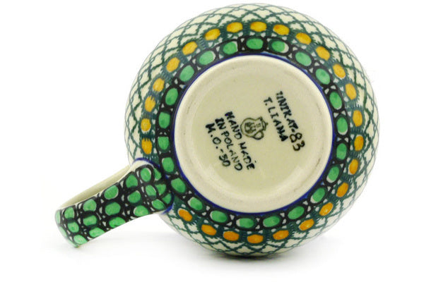 This Tranquility 16 oz Bubble Mug was handmade and hand decorated in Boleslawiec, Poland by skilled artisans according to old traditional methods. This is a Polish pottery Signature Unikat, which means that it has been hand painted with both sponges and brushes and it is signed by the artist who painted it. Unikat pieces are the most intricate works of art. Larger Unikat items take hours of very careful work to finish. This Polish stoneware is microwave, dishwasher, freezer, and oven safe up to 480°F. It does not contain lead or cadmium. It is part of the Tranquility Collection.