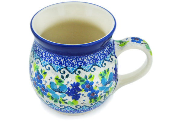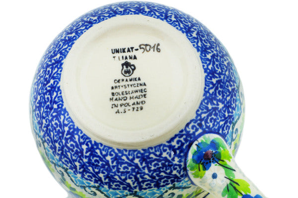 This Ambrosial Blues 16 oz Bubble Mug was handmade and hand decorated in Boleslawiec, Poland by skilled artisans according to old traditional methods. This is a Polish pottery Signature Unikat, which means that it has been hand painted with both sponges and brushes and it is signed by the artist who painted it. Unikat pieces are the most intricate works of art. Larger Unikat items take hours of very careful work to finish. This Polish stoneware is microwave, dishwasher, freezer, and oven safe up to 480°F. It does not contain lead or cadmium. It is part of the Ambrosial Blues Collection.