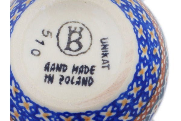 This Blue Cress 8 oz Bubble Mug was handmade and hand decorated in Boleslawiec, Poland by skilled artisans according to old traditional methods. This is a Polish pottery Signature Unikat, which means that it has been hand painted with both sponges and brushes and it is signed by the artist who painted it. Unikat pieces are the most intricate works of art. Larger Unikat items take hours of very careful work to finish. This Polish stoneware is microwave, dishwasher, freezer, and oven safe up to 480°F. It does not contain lead or cadmium. It is part of the Blue Cress Collection.
