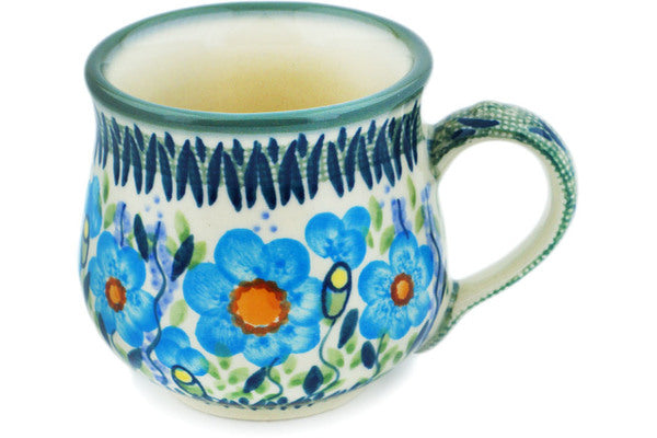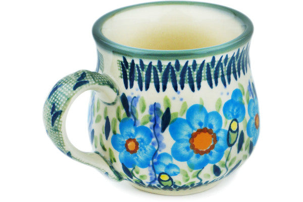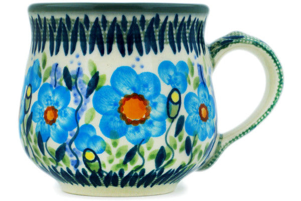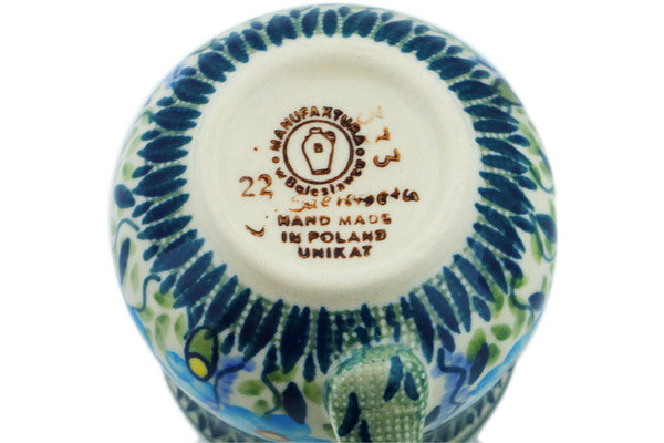 This Bright Blue Happiness 8 oz Bubble Mug was handmade and hand decorated in Boleslawiec, Poland by skilled artisans according to old traditional methods. This is a Polish pottery Signature Unikat, which means that it has been hand painted with both sponges and brushes and it is signed by the artist who painted it. Unikat pieces are the most intricate works of art. Larger Unikat items take hours of very careful work to finish. This Polish stoneware is microwave, dishwasher, freezer, and oven safe up to 480°F. It does not contain lead or cadmium. It is part of the Bright Blue Happiness Collection.