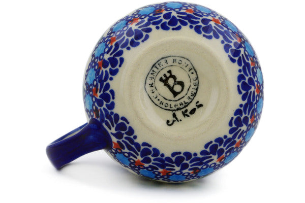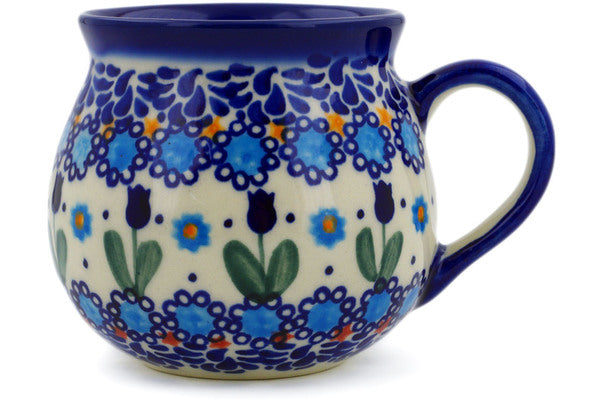 This Blue Tulip Garden 9 oz Bubble Mug was handmade and hand decorated in Boleslawiec, Poland by skilled artisans according to old traditional methods. This is a Polish pottery Signature Unikat, which means that it has been hand painted with both sponges and brushes and it is signed by the artist who painted it. Unikat pieces are the most intricate works of art. Larger Unikat items take hours of very careful work to finish. This Polish stoneware is microwave, dishwasher, freezer, and oven safe up to 480°F. It does not contain lead or cadmium. It is part of the Blue Tulip Garden Collection.
