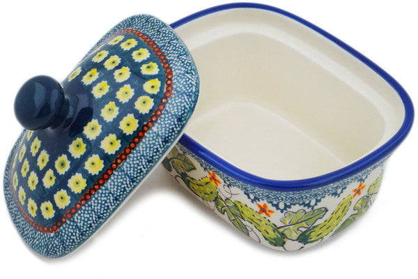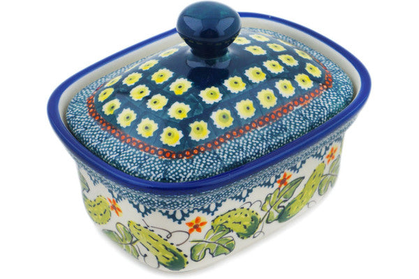 This Cucumber Patch 6" Butter box was handmade and hand decorated in Boleslawiec, Poland by skilled artisans according to old traditional methods. This Polish stoneware is microwave, dishwasher, freezer, and oven safe up to 480°F. It does not contain lead or cadmium. It is part of the Cucumber Patch Collection.