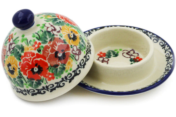 This Pansy Garden 4" Butter Dish was handmade and hand decorated in Boleslawiec, Poland by skilled artisans according to old traditional methods. This is a Polish pottery Signature Unikat, which means that it has been hand painted with both sponges and brushes and it is signed by the artist who painted it. Unikat pieces are the most intricate works of art. Larger Unikat items take hours of very careful work to finish. This Polish stoneware is microwave, dishwasher, freezer, and oven safe up to 480°F. It does not contain lead or cadmium. It is part of the Pansy Garden Collection.