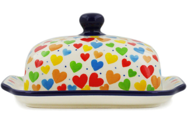 This In Love With Love 7" Butter Dish was handmade and hand decorated in Boleslawiec, Poland by skilled artisans according to old traditional methods. This is a Polish pottery Signature Unikat, which means that it has been hand painted with both sponges and brushes and it is signed by the artist who painted it. Unikat pieces are the most intricate works of art. Larger Unikat items take hours of very careful work to finish. This Polish stoneware is microwave, dishwasher, freezer, and oven safe up to 480°F. It does not contain lead or cadmium. It is part of the In Love With Love Collection.