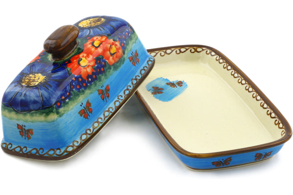 This Blue Garden 8" Butter Dish was handmade and hand decorated in Boleslawiec, Poland by skilled artisans according to old traditional methods. This is a Polish pottery Signature Unikat, which means that it has been hand painted with both sponges and brushes and it is signed by the artist who painted it. Unikat pieces are the most intricate works of art. Larger Unikat items take hours of very careful work to finish. This Polish stoneware is microwave, dishwasher, freezer, and oven safe up to 480°F. It does not contain lead or cadmium. It is part of the Blue Garden Collection.