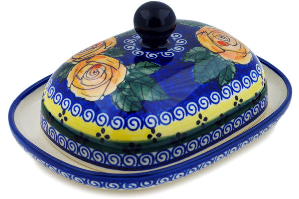 This Cabbage Roses 8" Butter Dish was handmade and hand decorated in Boleslawiec, Poland by skilled artisans according to old traditional methods. This Polish stoneware is microwave, dishwasher, freezer, and oven safe up to 480°F. It does not contain lead or cadmium. It is part of the Cabbage Roses Collection.