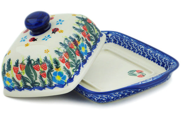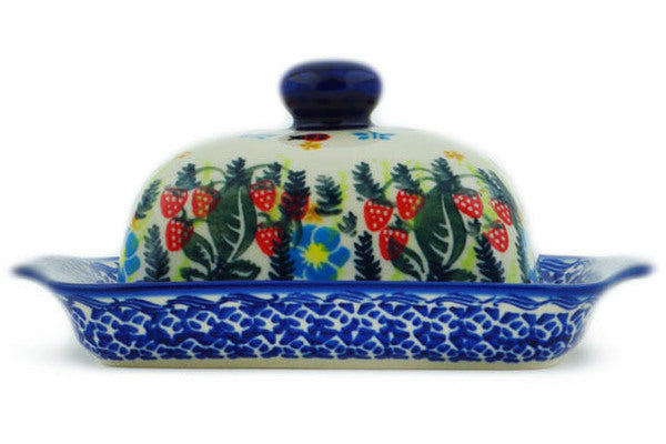 This Spring Garden Berries 8" Butter Dish was handmade and hand decorated in Boleslawiec, Poland by skilled artisans according to old traditional methods. This is a Polish pottery Signature Unikat, which means that it has been hand painted with both sponges and brushes and it is signed by the artist who painted it. Unikat pieces are the most intricate works of art. Larger Unikat items take hours of very careful work to finish. This Polish stoneware is microwave, dishwasher, freezer, and oven safe up to 480°F. It does not contain lead or cadmium. It is part of the Spring Garden Berries Collection.