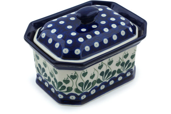 This Bleeding Heart Peacock 6" Cake Box 6" was handmade and hand decorated in Boleslawiec, Poland by skilled artisans according to old traditional methods. This Polish stoneware is microwave, dishwasher, freezer, and oven safe up to 480°F. It does not contain lead or cadmium. It is part of the Bleeding Heart Peacock Collection.