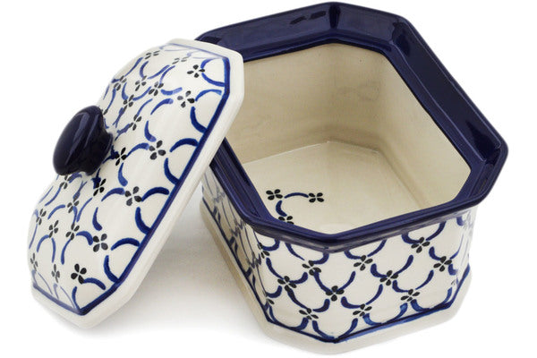 This Garden Lattice 6" Cake Box 6" was handmade and hand decorated in Boleslawiec, Poland by skilled artisans according to old traditional methods. This Polish stoneware is microwave, dishwasher, freezer, and oven safe up to 480°F. It does not contain lead or cadmium. It is part of the Garden Lattice Collection.