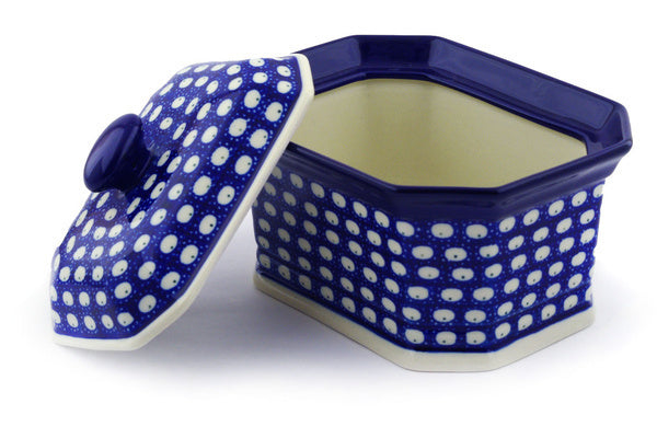 This Stepping Stones 6" Cake Box 6" was handmade and hand decorated in Boleslawiec, Poland by skilled artisans according to old traditional methods. This Polish stoneware is microwave, dishwasher, freezer, and oven safe up to 480°F. It does not contain lead or cadmium. It is part of the Stepping Stones Collection.