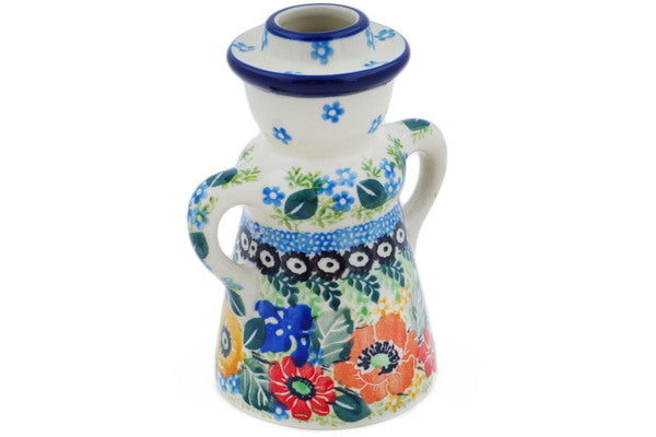 This Iris Meadow 5" Candle Holder was handmade and hand decorated in Boleslawiec, Poland by skilled artisans according to old traditional methods. This is a Polish pottery Signature Unikat, which means that it has been hand painted with both sponges and brushes and it is signed by the artist who painted it. Unikat pieces are the most intricate works of art. Larger Unikat items take hours of very careful work to finish. This Polish stoneware is microwave, dishwasher, freezer, and oven safe up to 480°F. It does not contain lead or cadmium. It is part of the Iris Meadow Collection.