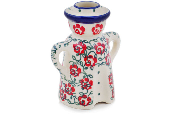 This Rose Vines 5" Candle Holder was handmade and hand decorated in Boleslawiec, Poland by skilled artisans according to old traditional methods. This is a Polish pottery Signature Unikat, which means that it has been hand painted with both sponges and brushes and it is signed by the artist who painted it. Unikat pieces are the most intricate works of art. Larger Unikat items take hours of very careful work to finish. This Polish stoneware is microwave, dishwasher, freezer, and oven safe up to 480°F. It does not contain lead or cadmium. It is part of the Rose Vines Collection.